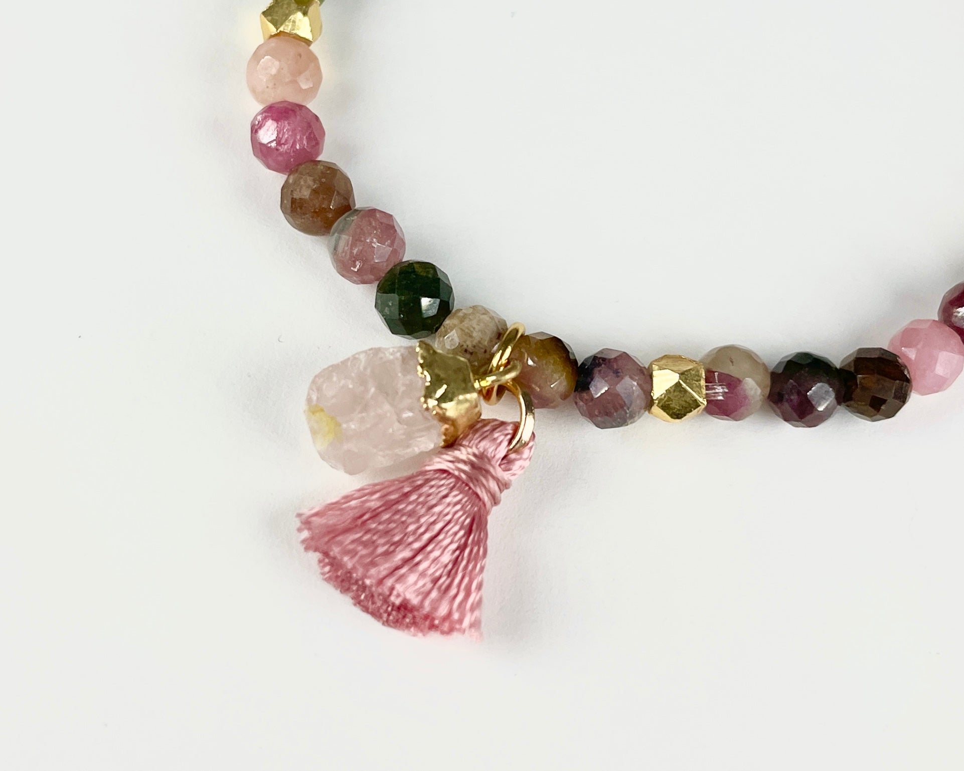 Faceted Rainbow Tourmaline Stretch Bracelet with Rose Quartz Charm 14Kt gold plated